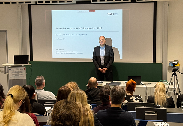 Im Januar präsentierte das GWT-Medizinteam der gesamten Belegschaft die wichtigsten Lösungsansätze in komprimierter Form. Aufgezeigt wurden mögliche Maßnahmen zur Schließung der Translationslücke zwischen medizinischer Forschung bis zur klinischen Anwendung von innovativen Therapien. Die Vereinfachung bürokratischer Prozesse sowie Genehmigungsverfahren, aber auch die Stärkung einer engeren Zusammenarbeit zwischen Forschungsinstituten, Unternehmen und Behörden können Basis für schnellere Entwicklungszyklen in der Medikamentenforschung sein, um neue innovative, wirksame und sichere Therapie für die Patienten bereitzustellen. Dabei spielt das Medizinforschungsgesetz (MFG) sowie die Entwicklungen rund um die Künstliche Intelligenz (KI) eine zentrale Rolle.